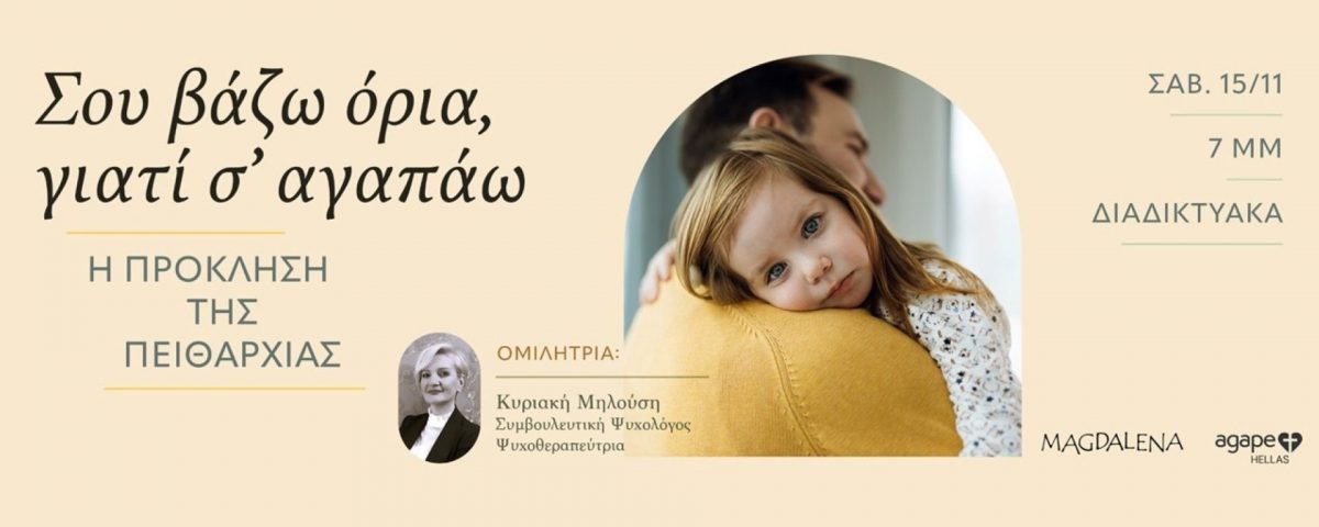 With great interest and high participation, the online event organized by Agape Hellas and Magdalena, titled “I Set Boundaries Because I Love You – The Challenge of Discipline,” took place on Saturday, November 15th, 2025, at 19:00. The event was aimed at parents, educators, and all those wishing to strengthen their relationships with children and adolescents, offering practical knowledge and valuable guidance on this important topic.